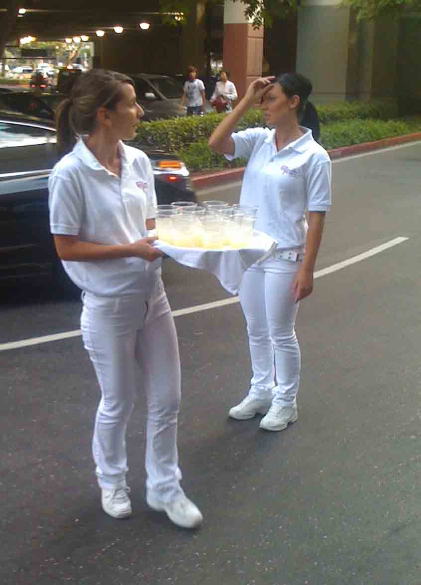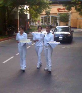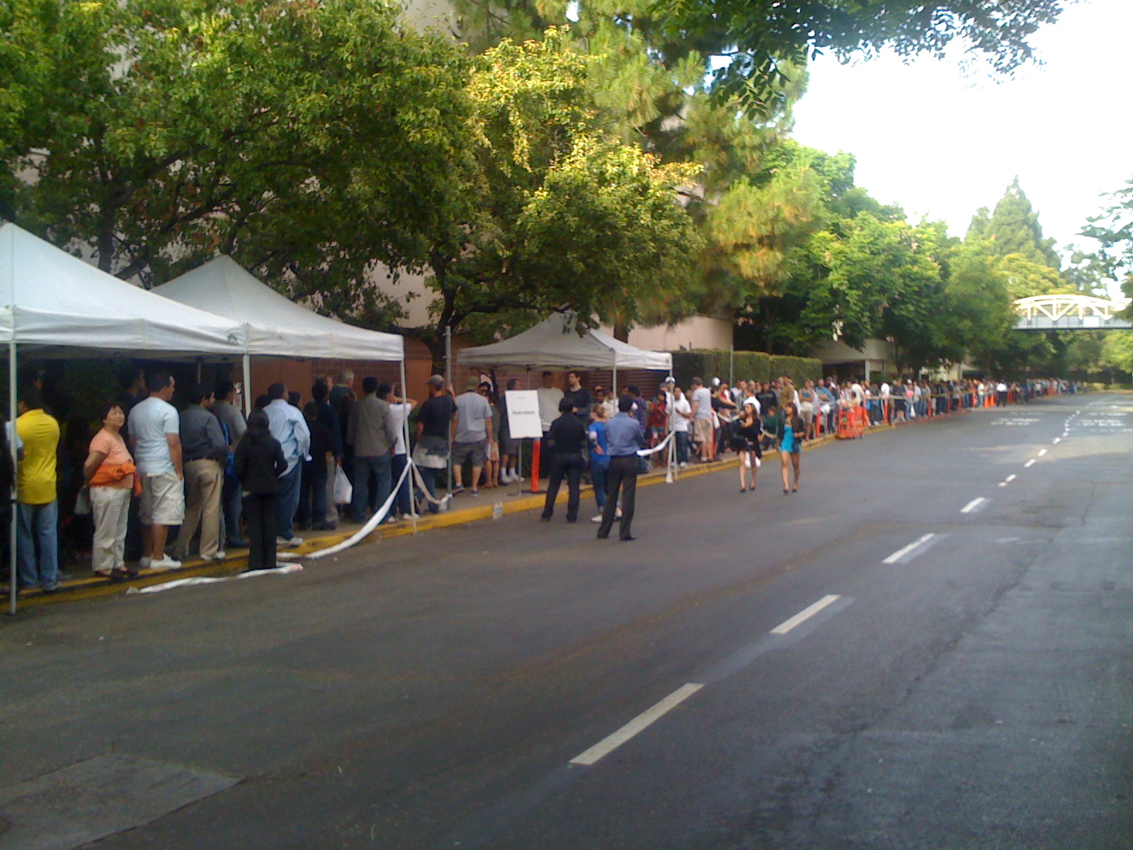 Entre todos los amantes de la tecnología, estaban los que ya contabamos con un iphone, otros con sus laptops, viendo películas, bajando música, intercambiando información y otros aburridísimos con nuestros ipads, leyendo, jugando, en fin matando el tiempo a balazos, pero lo más triste de todo es que la línea avanzaba mas lenta que una tortuga, a medida que se engrosaba la línea de los que tenían reservación a los cuales se les daba preferencia y eso que pasaban en promedio de 30 personas cada media hora, nuestra línea avanzaba de 5 en 5 y parecía un via crucis, lo que si quiero destacar aqui el esfuerzo, la dedicación, los pastelitos, el pollito, la limonada, y una serie de bocaditos que las personas de Cheesecake Factoy nos estubieron repartiendo durante toda nuestra estancia en las afueras de ValleyFair, sin su alimentación que dicho sea de paso muy buena, un día de estos tendre que hacerles una visita, asi como su amabilidad, se hubiese hecho mas dura nuestra estancia, gracias a todos y sobre todo a todas estas lindas personas, aqui les dejo una foto de alguna de ellas, gracias, logicamente a los organizadores que hicieron más llevadera nuestra larga espera, y seguimos, las horas pasaban, la líneas en vez de disminuir, aumentaban, algunas inteligentes, (una que tenía a mis espaldas) creyó que esto era un día de campo, vino con su perro, yo dije hubiese venido con mi hamster, pero en fin encima todos le hacían cariñito al perro de marras, pero lo queríamos freir en aceite por molestoso, en fin pronto se canso, y se fue con perro y todo, seguimos viendo peliculas, hablando de libros, programas, uno que otro software, seguimos con la limonada, llegaban las 5, luego las 6 y avanzabamos hacía atras, llegaban las preguntas de siempre, ¿Hay suficiente stock?, ¿llegaremos?, estirabamos las piernas, sentados en el suelo, parados, caminando, frotandonos las manos, pero del frio que empezaba a anunciar un tiempo dificil, sobre todo para aquellos que como yo estabamos en manga corta, llamada urgente, a mi querida esposa, necesito algo que ponerme, casi me trae un abrigo, no, necesito algo para el frio, luego la espera, no llegaba, se había perdido, como los bomberos que llegan cuando se acabó el incendio, pero no nos encontraba, parece que era díficil ver a 1,000 personas haciendo línea, luego, por fin me encontró o yo la encontre y ya la cosa fue mas llevadera, aquí les pongo una foto de como estaba la línea, pasaban las horas, y la noche empezaba a oscurecer nuestras esperanzas, la noche negra, ya se habían terminado los pastelitos, ya no más limonada ni pizza, mucho menos el pollito, sale un encargado de la Apple y nos dice que solamente tendrán preferencia los que tenían reservación y luego de terminar con ellos, veníamos nosotros, ni modo, hicieron una lista (la  tonta no vino) en donde cada uno pusimos nuestros datos, y nos avisarían para pasar otro día por nuestro iPhone4, o si queríamos podíamos regresar el viernes por la mañana a volver a hacer nuestra línea, algunos nos quedamos un tiempo más, pasaban ya las 11 de la noche, ya casi, solo faltaban unos 200 en la línea de los que tenían reservación, y unos 40 en la nuestra, (muchos ya se habían retirado, enojados claro esta) pero vino la mala noticia, nos dijeron que a las 12 se cerraba todo, asi es que adios, vamonos porque no llegamos ni en bus, tristes, meditabundos, cabisbajos, con sueño, un poco de hambre, frio, lagrimas en los ojos, nos retiramos arrastrando los pies, pero con la formal promesa de vernos al día siguiente.