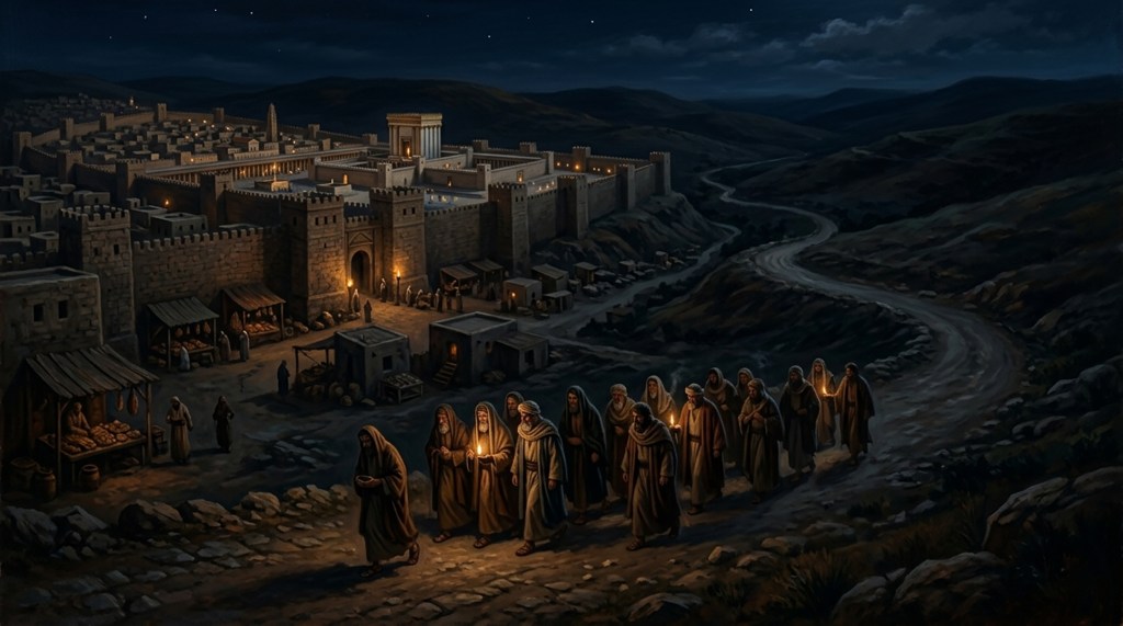 Jerusalén queda atrás, iluminada y ruidosa.